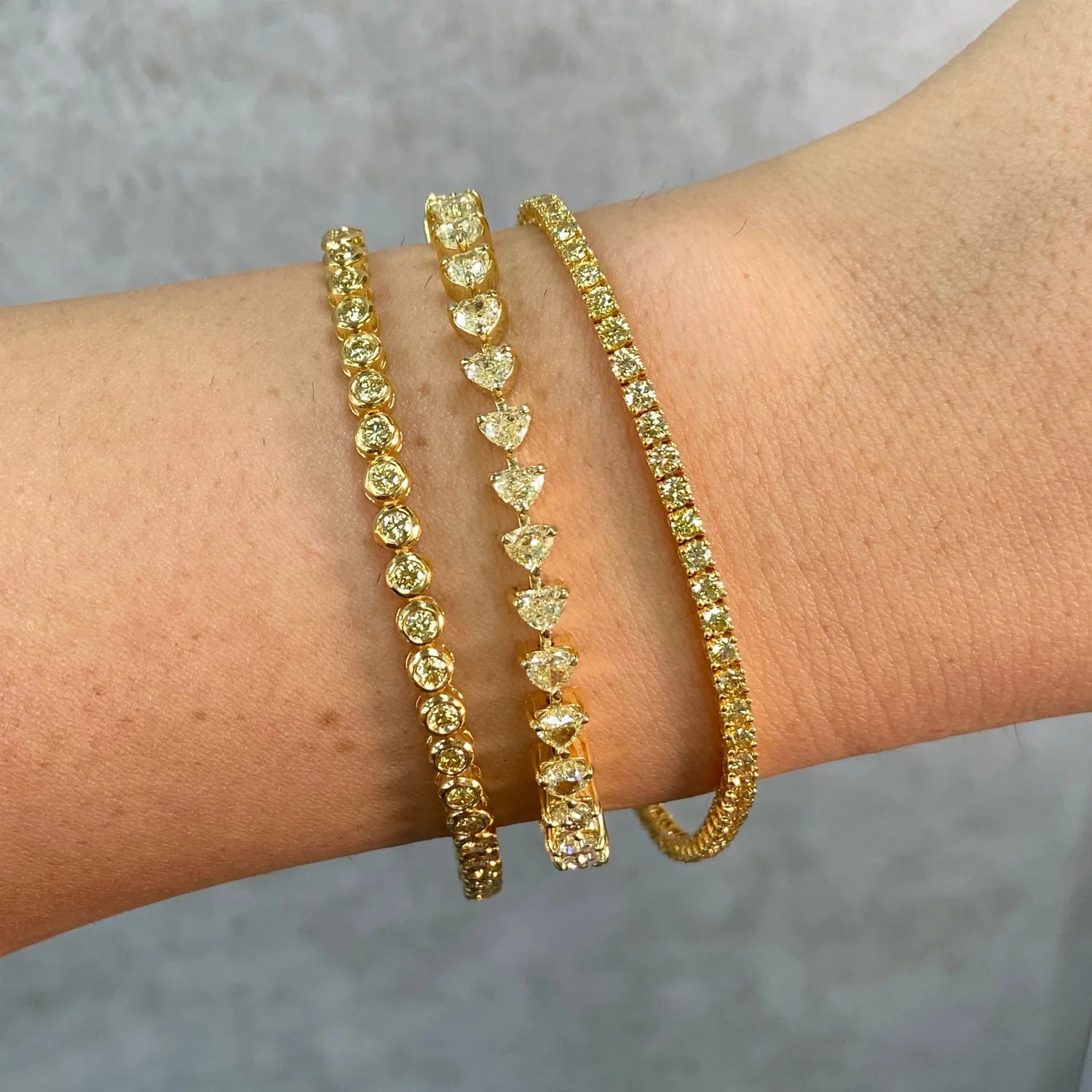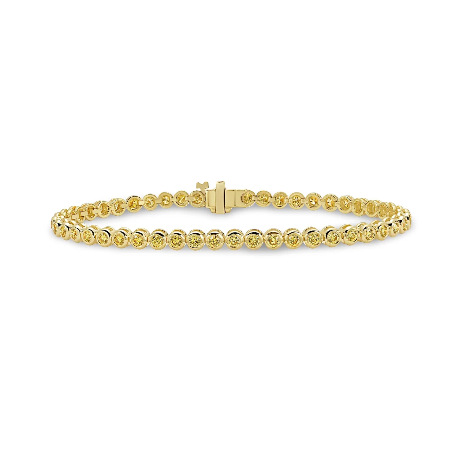 Bright and full of character, this handmade bracelet brings together 49 round fancy intense yellow diamonds totaling 2.40 carats. Each diamond is bezel set in 14k gold, creating a seamless line of golden radiance that’s as refined as it is striking. Crafted by hand in New York City, it’s a modern classic designed to be worn every day yet extraordinary enough to stand out anywhere.