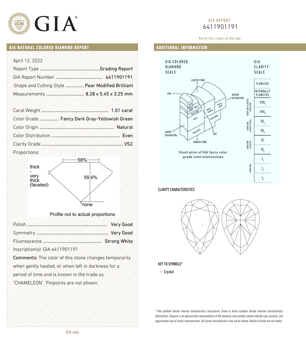 This natural 1.01 carat pear-shaped diamond is GIA-certified with a rare Fancy Dark Gray-Yellowish Green color grade. As a "Chameleon" diamond, it possesses the natural ability to temporarily change color when kept in darkness or when gently heated.