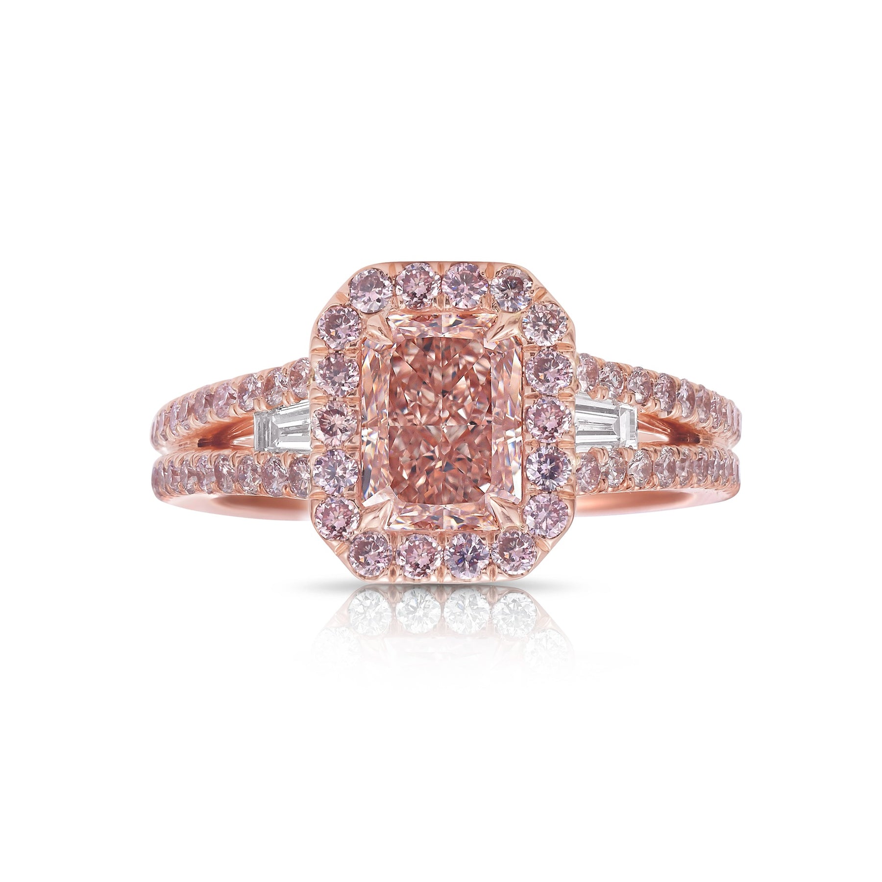 - 0.69ct Surrounding Fancy Pink Round Diamonds in halo design