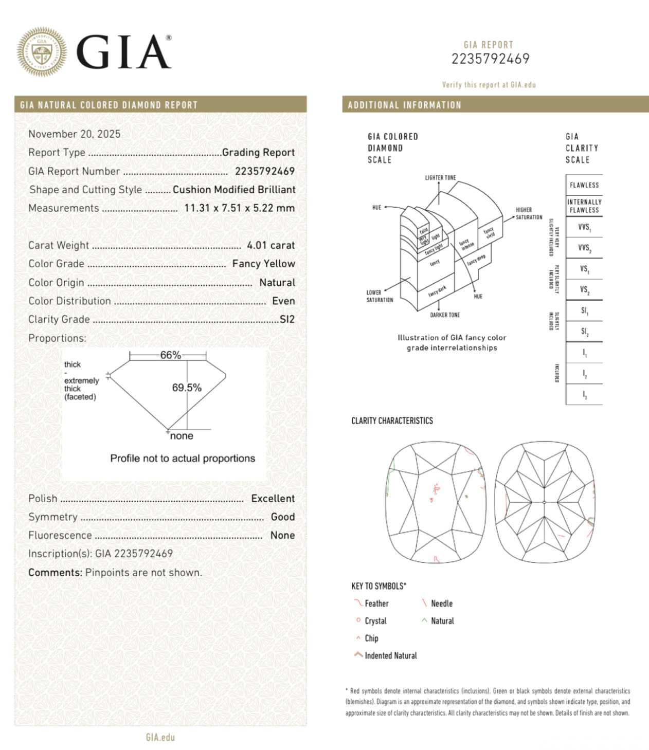 4.01ct Fancy Yellow Elingated Cushion SI2 GIA