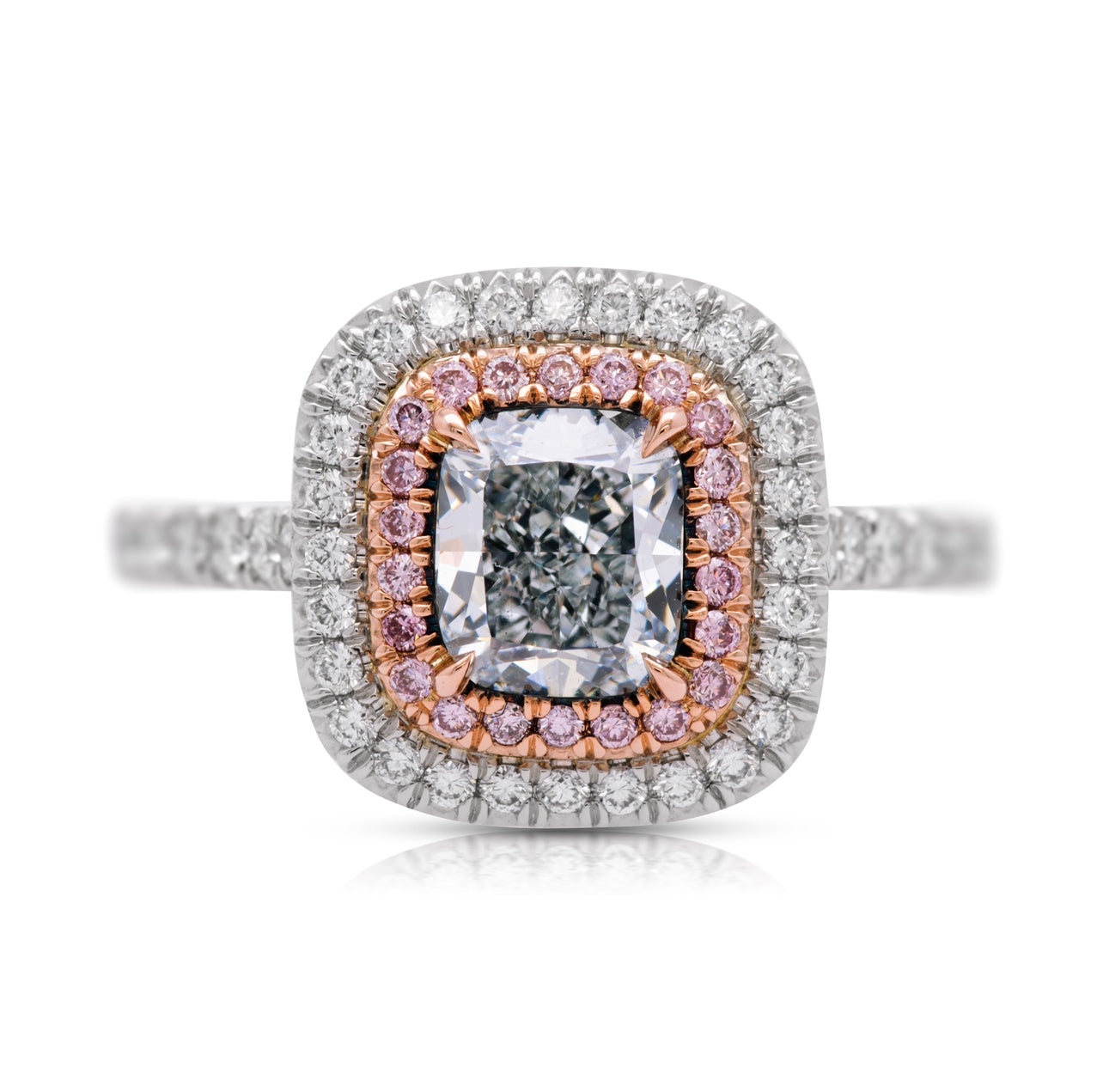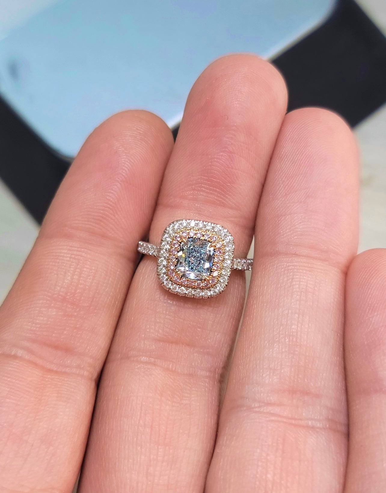 • GIA certified “Light Blue” cushion with a cool steely blue hue. Set in Platinum and 18kt RG with 0.44ct of pink and white round diamonds